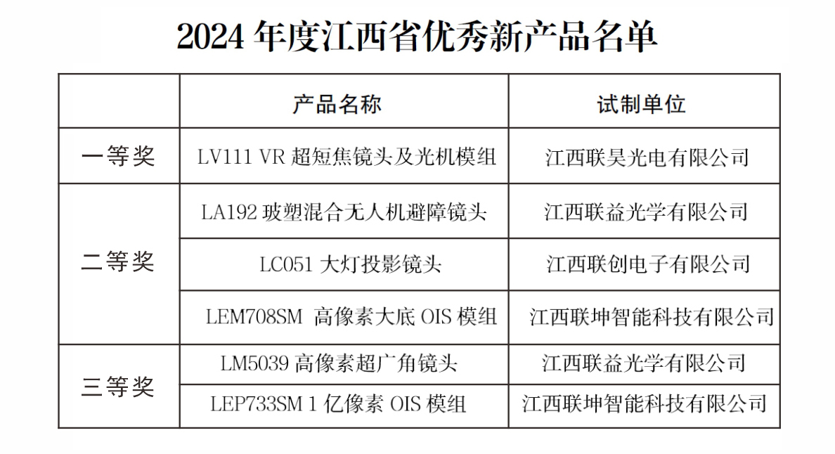 2025年8月13日,江西省工业和信息化厅发布《关于公布2024年度江西省优秀新星空(中国)官方体育网站名单的通知》中,联创电子旗下四家成员单位凭借卓越的自主研发能力,共获一等奖1款、二等奖3款、三等奖2款,充分体现了公司在技术创新和星空(中国)官方体育网站研发方面的综合实力。